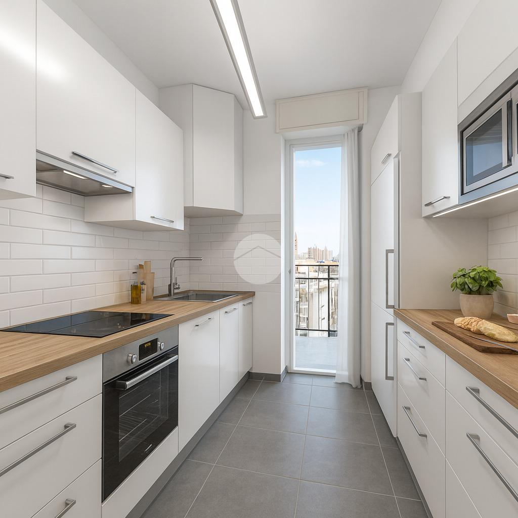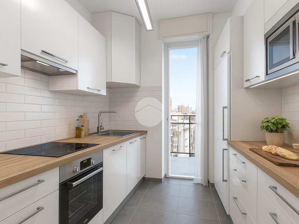 L’ingresso tramite porta blindata si apre su un corridoio che conduce al luminoso soggiorno e alla cucina abitabile, dalla quale si accede al un balcone, valorizzato dall’altezza del piano e capace di offrire una bella vista sulla città.