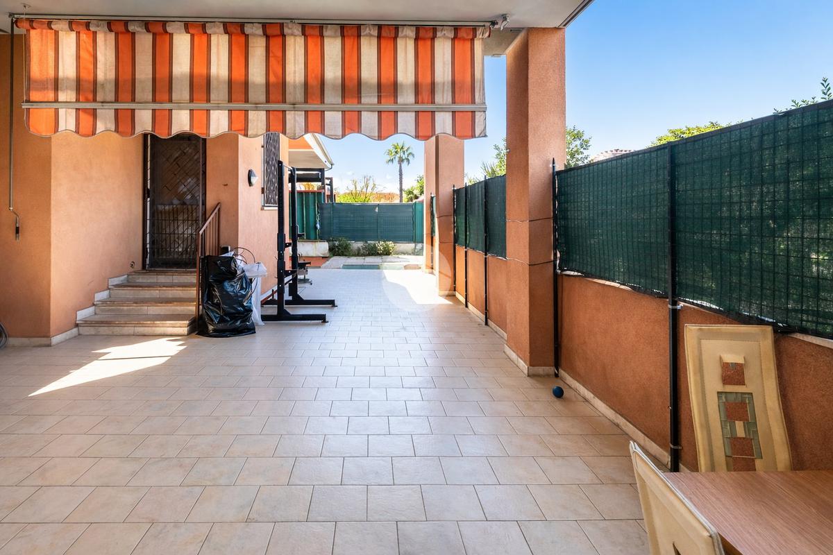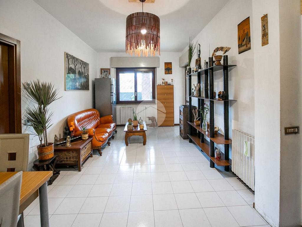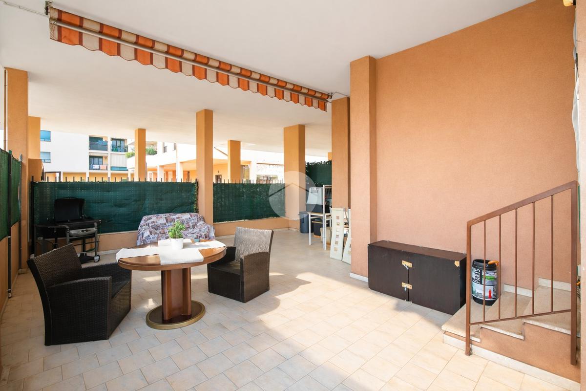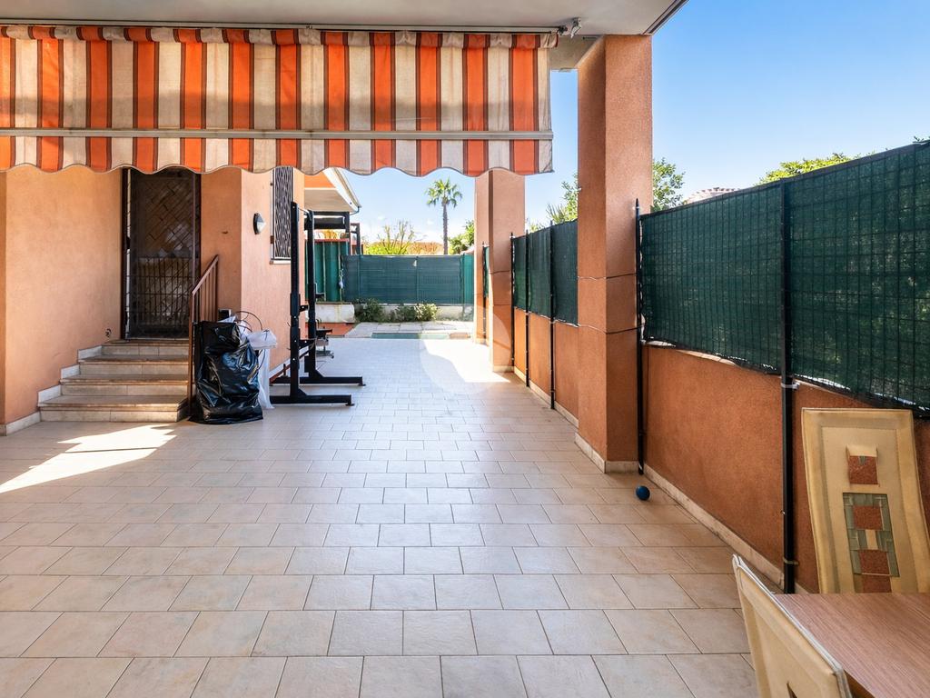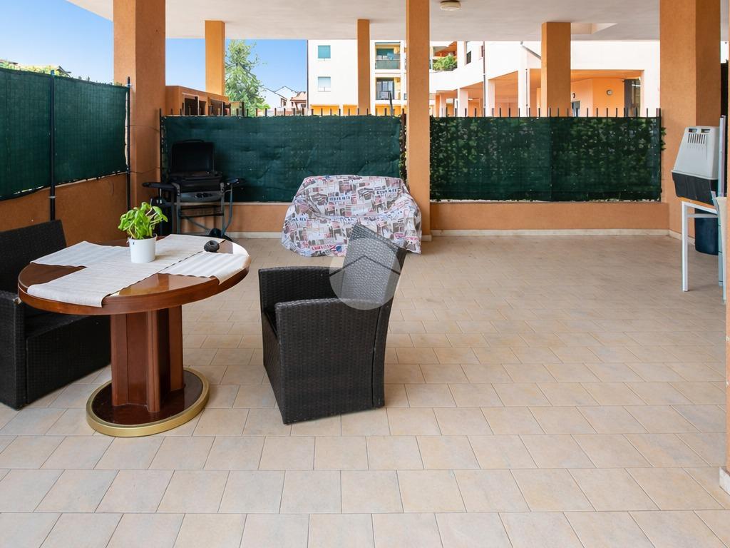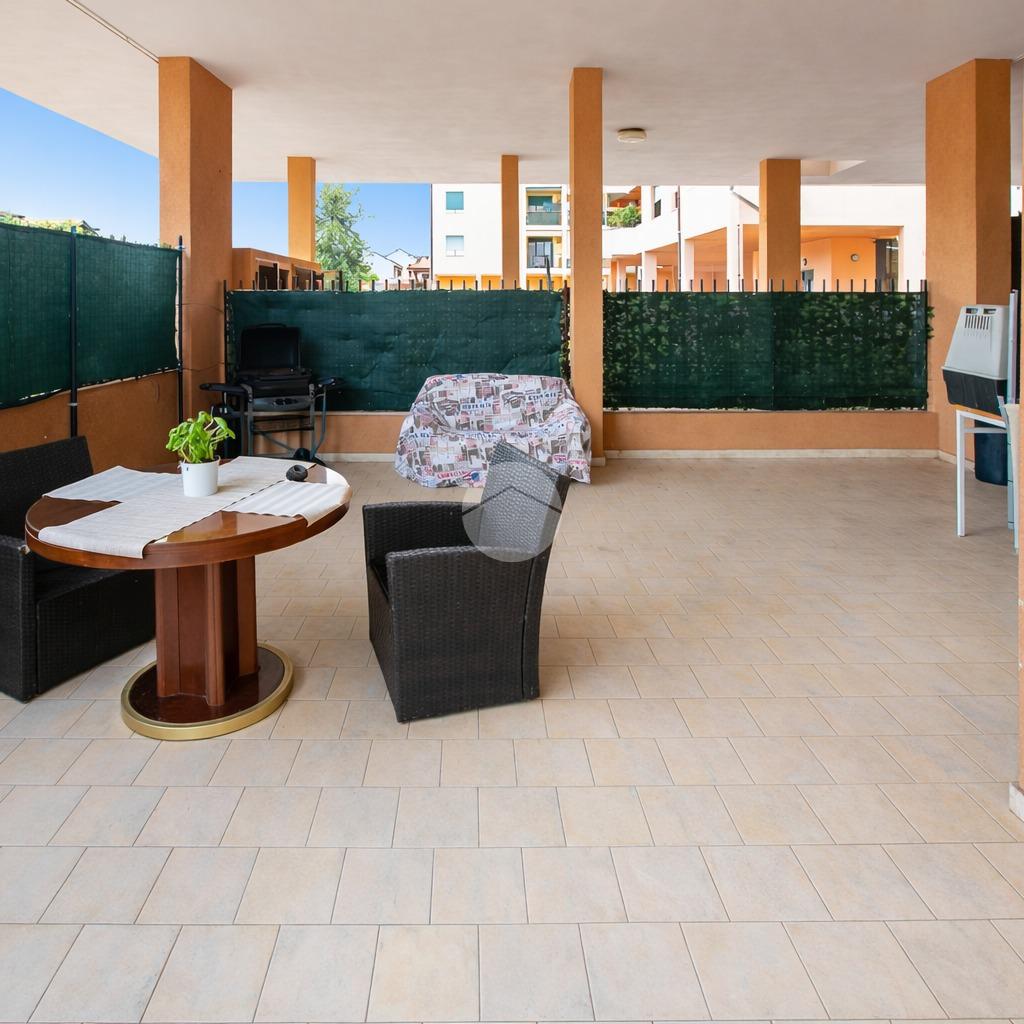 L’ingresso apre su un soggiorno con cucina a vista, collegato direttamente allo spazio esterno privato, composto da una parte coperta tipo portico, perfetta da vivere in ogni stagione, e da una zona piastrellata scoperta, riservata e ordinata, ideale come area relax o sfogo esterno funzionale.